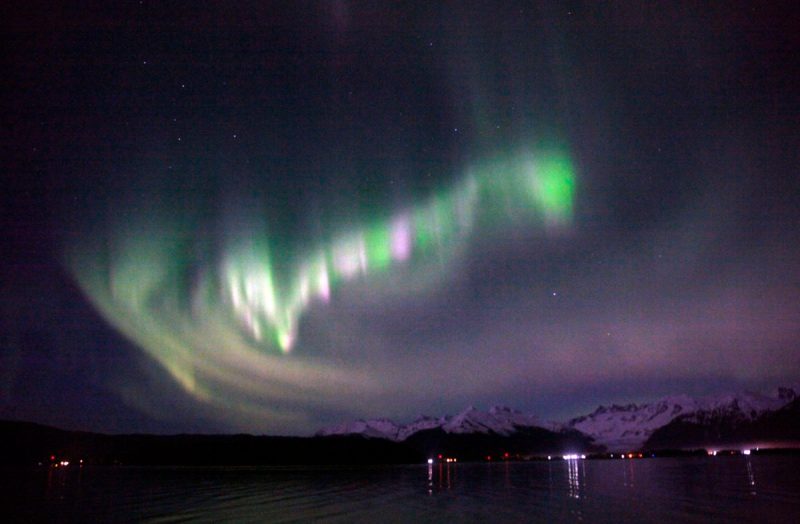 The aurora borealis produces neon green waves in the night sky when electrons from space collide with atoms and molecules of the upper atmosphere of Earth, according to NASA. The result is similar to when electrons collide with neon gas to create bright lightbulbs.
