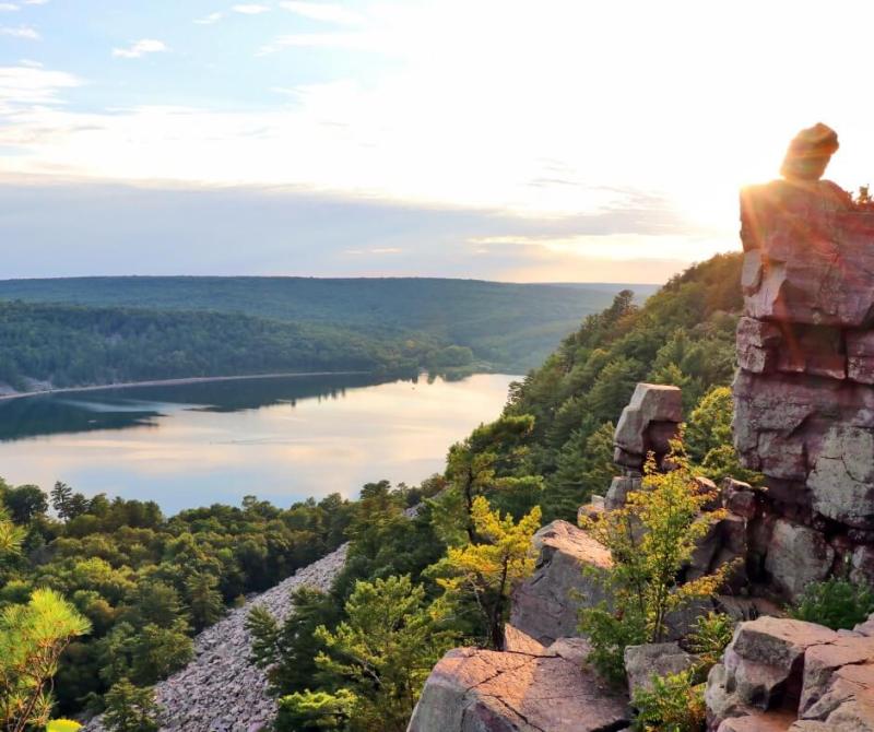 The park is famous for its 500-foot quartzite bluffs with features such as the Balancing Rock and Devil’s Doorway. The top of the bluffs look out onto a 360-acre lake.
