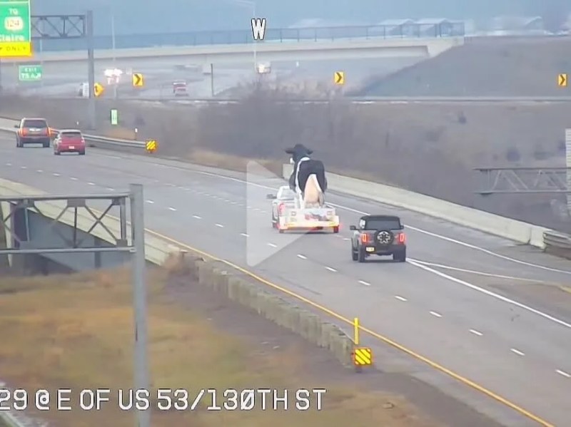 HOLY COW! 🐄 A traffic camera in Eau Claire recently showed vehicles moving along nicely, including a truck carrying a massive cow figure on its trailer. 🎥: Wisconsin Department of Transportation via Storyful