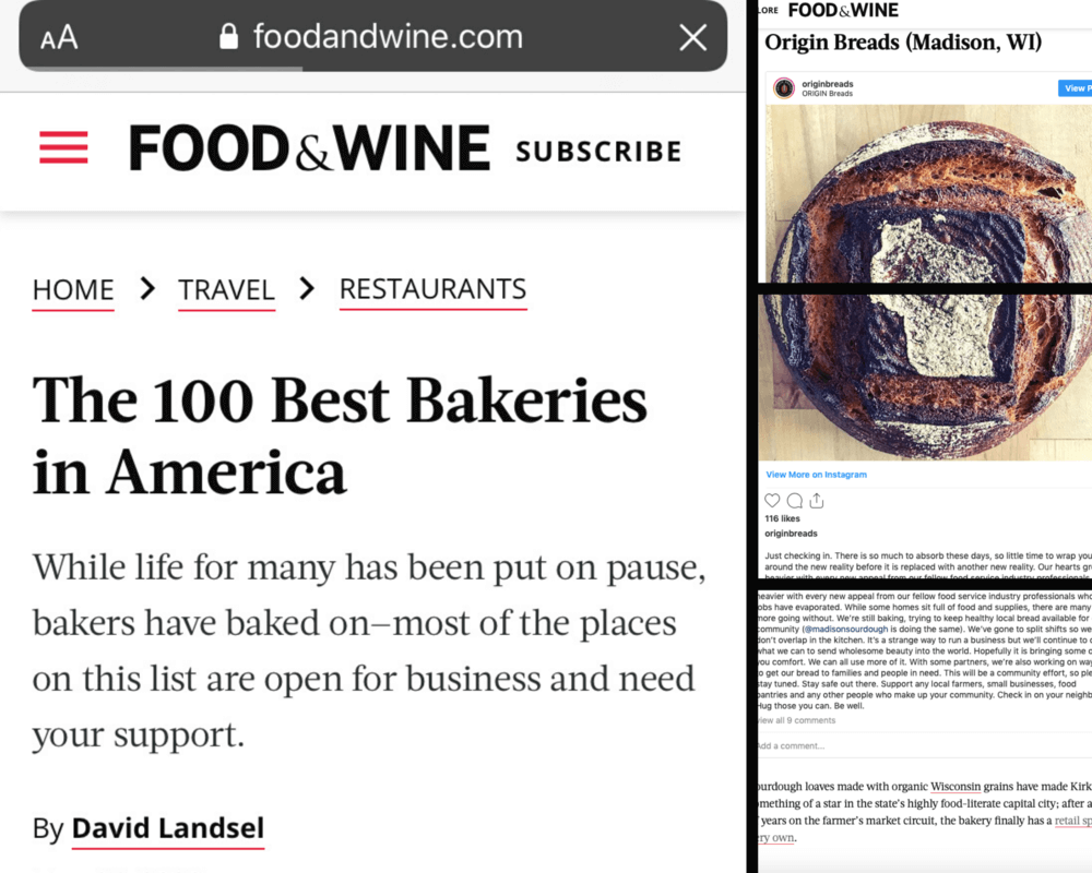 Last year, ORIGIN Had the honor of representing Wisconsin in Food & Wine Magazine’s “The Best Bread in Every State.”