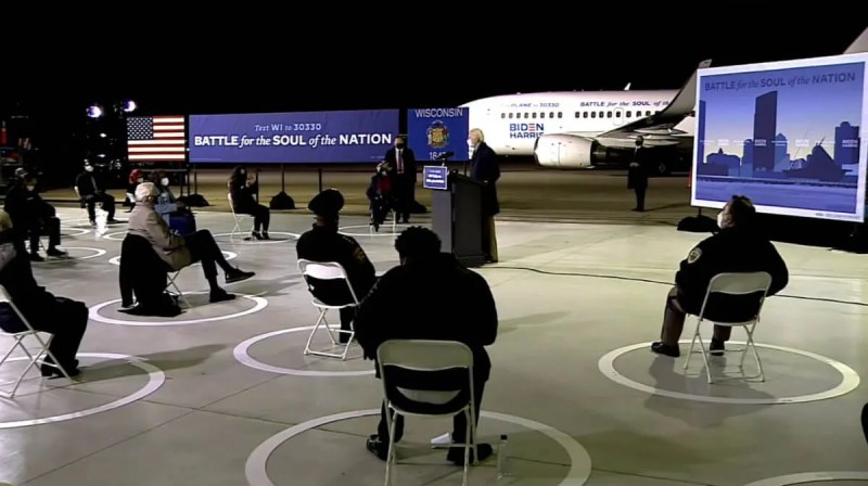 About four hours after President Donald Trump wrapped up his third crowded Wisconsin rally of the week, Democratic presidential nominee Joe Biden stood behind a podium at a hangar in Mitchell International Airport in Milwaukee for a limited, socially distanced speech in which he covered many familiar beats in his closing arguments of the 2020 campaign.