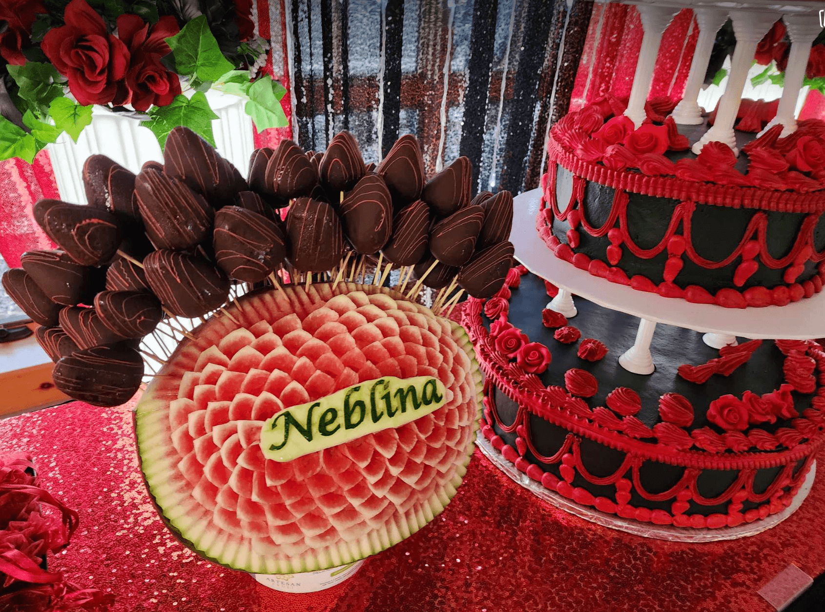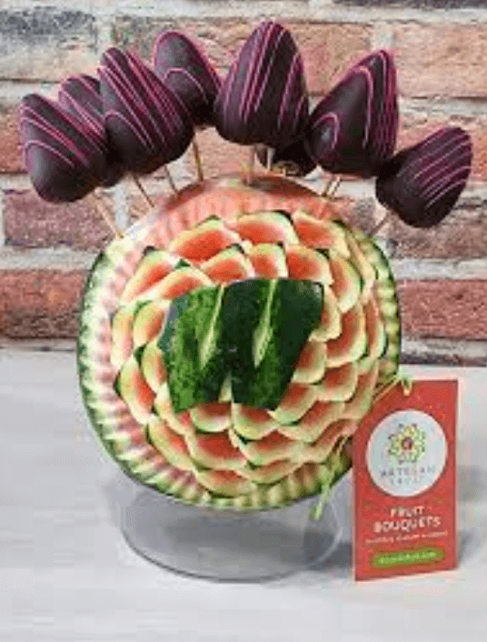 Eder Valle, Owner: We create unique, edible artwork using watermelons and chocolate-covered strawberries in both small and large fruit bouquets. The small comes with 12 strawberries, and the large comes with 18. We can also create faces, custom names, and business logos.