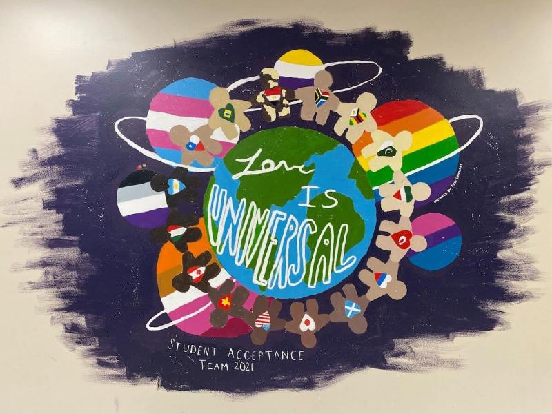 The mural that was somehow not inclusive enough for the district included the nonbinary, asexual, bisexual, lesbian, transgender, and rainbow pride flags; flags from 16 different countries; and 16 people of different races and ethnicities holding hands around the planet Earth with the words “Love is Universal.”