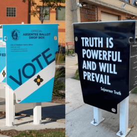 After a controversial state Supreme Court decision, Madison rehires original artist to turn 14 dropboxes into art, with information on how to vote.