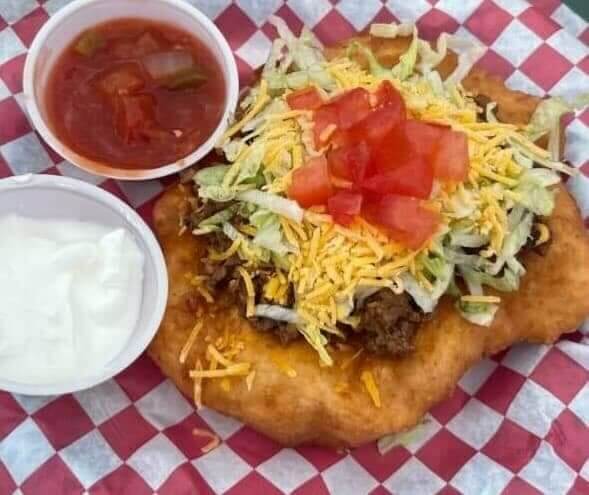 Our big seller is the Indian Taco–frybread topped with taco meat, lettuce, tomatoes, and cheese. We also serve pulled pork on a frybread bun and powwow fries, which are french fries with our special seasonings, smothered in nacho cheese. Jalapeño cheese curds are another favorite. We also have walking tacos, nachos, candy, soda, and ice cream.