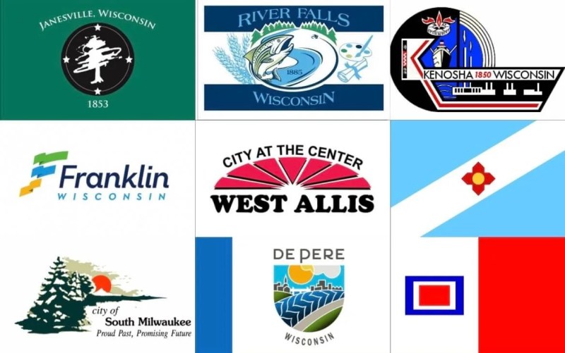 The flags from De Pere, Franklin, Janesville, Kenosha, River Falls, South Milwaukee, and West Allis all have lettering or seals, and De Pere’s also uses at least seven different colors.