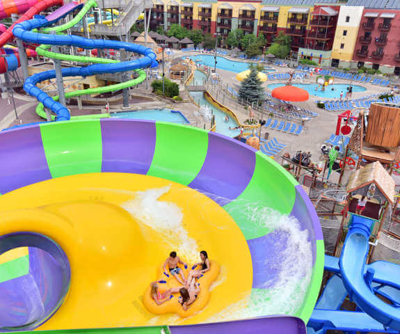 The Kalahari is the Dells’ most famous resort, and for good reason. One of the biggest at 125,000 square feet, this Safari adventure-themed park has more than a dozen different attractions. The Leopard’s Lair and Wave Pool are family favorites, but if you’re feeling bold, try the whirlpool-like Tanzanian Twister, drop 60 feet on the Screaming Hyena, or test your bodyboarding skills on the Flow Rider surf-simulator. And when you’re tired of water, check out the Timbavati Wildlife Park or the Tommy Bartlett Exploratory; both are free with your resort stay!