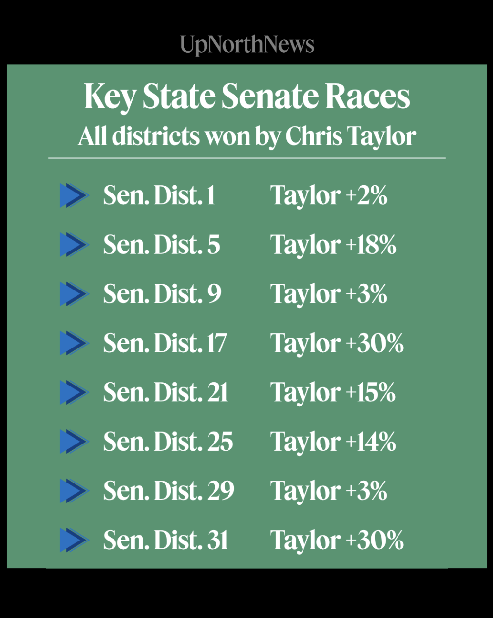 There are 16 State Senate seats up for grabs in November, eight of those districts are thought to be competitive — and Taylor won in all of them.