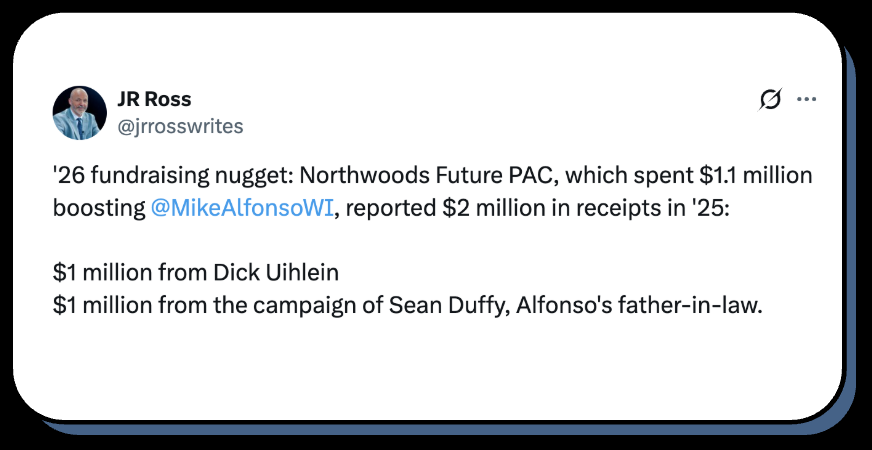 1️⃣ The Republican primary for governor isn’t scheduled until Aug. 11, but GOP voters likely won’t have to bother showing up now that President Trump has endorsed US Rep. Tom Tiffany, which led the only other Republican candidate, Washington County Executive Josh Schoemann, to pull out of the race.