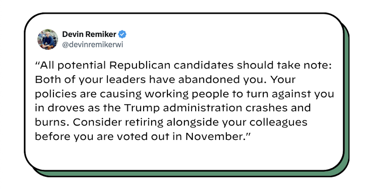 1️⃣ Republican Exodus – State Senate Majority Leader Devin LeMahieu (R-Oostburg) is the latest high-profile Republican to join a growing list of GOP lawmakers deciding not to run for reelection in November. He joins Assembly Speaker Robin Vos (R-Rochester) and Sens. Van Wanggard (R-Racine), Steve Nass (R-Whitewater), and Rob Hutton (R-Brookfield) in choosing to leave the Legislature. And conservative state Supreme Court Justice Annette Ziegler has announced a year in advance that she won’t run for reelection in 2027. State Democratic Party Chair Devin Remiker has noticed: