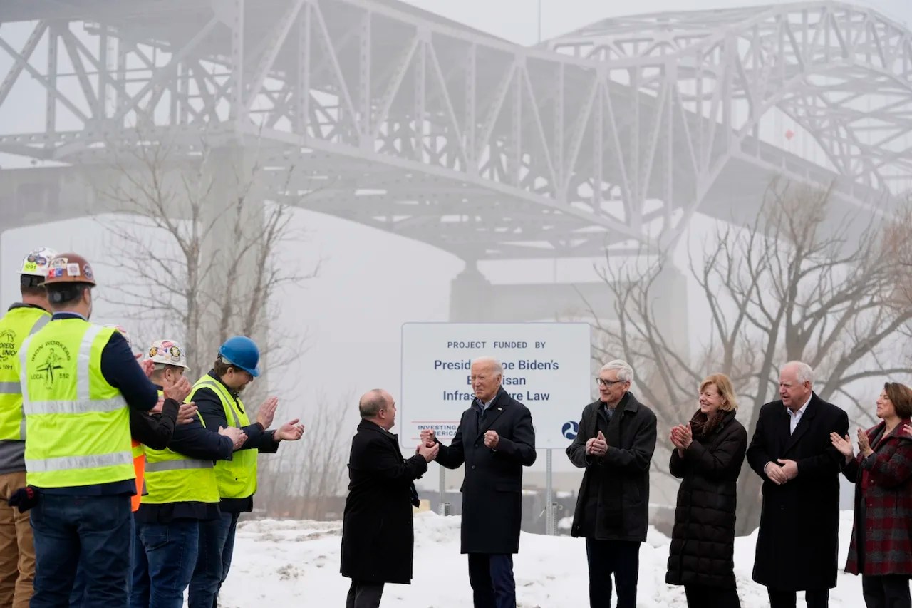 President Joe Biden speaks near the John A. Blatnik Bridge between Duluth, Minn., and Superior, Wis., Thursday, Jan. 25, 2024, in Superior. Biden (center) was accompanied by (l.-r.) Gov. Tony Evers, Sen. Tammy Baldwin, MN Gov. Tim Walz, MN Sen. Amy Klobuchar, and MN Sen. Tina Smith. (AP Photo/Alex Brandon)